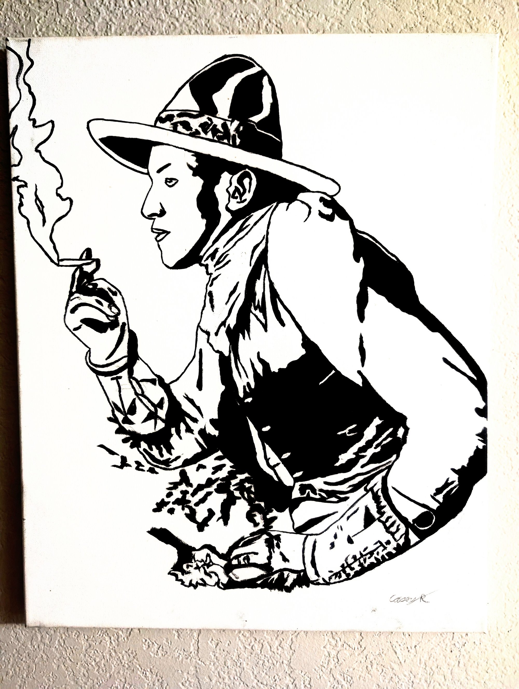 This piece captures a moment of quiet reflection. The high contrast style lends a cinematic quality to the subject, a figure in a hat with their face cast downward in thought. A powerful meditation on introspection, this piece offers a bold aesthetic and compelling emotional depth.